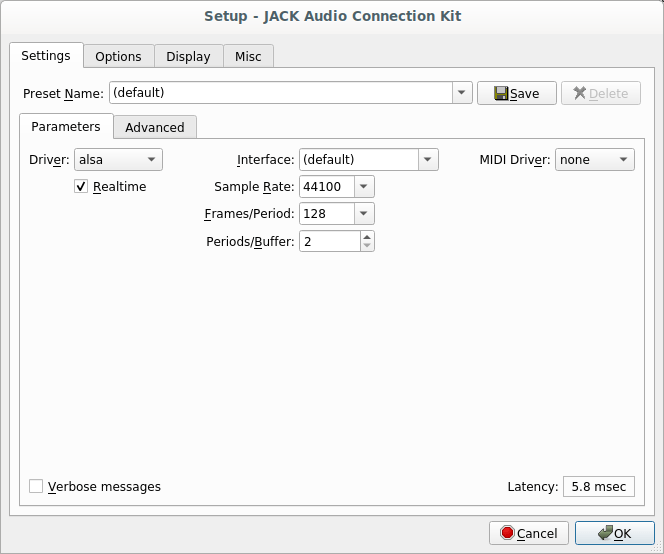 I use the jack-keyboard program to emulate a MIDI keyboard, so that I can generate MIDI commands. To monitor these MIDI commands, I will use the jack_midi_dump program. First however, start the qjackctl program, and check that the settings are as in the following figures.