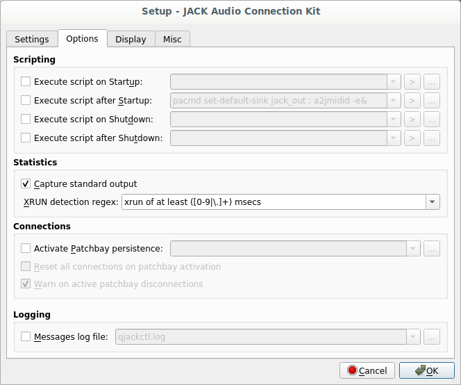 In the below figure, note that I have disabled the “Execute script after Startup” command. It was needed previously to map ALSA style MIDI to Jack MIDI using a2jmidid. But now PipeWire does this automatically, so the setting is simpler.