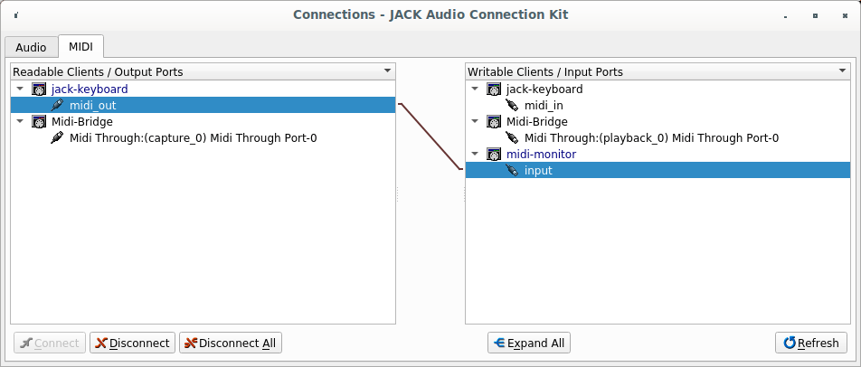 Now, if you click a key on the virtual keyboard of jack-keyboard, the note information should be shown in the terminal window of jack_midi_dump. Now that this works, you can try connecting your external MIDI keyboard to your computer and make the connection in qjackctl between the keyboard and the midi-monitor. Again, the notes should be shown in the terminal window. So, the MIDI input seems to be working.