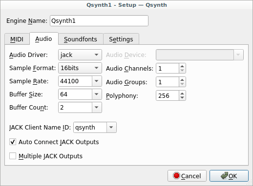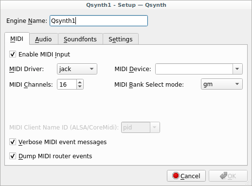 Now both the virtual and external MIDI keyboards should show note information on the jack_midi_dump and a sound should be played by qsynth. Note that even though the settings I described above work for me they may not be the optimal ones.