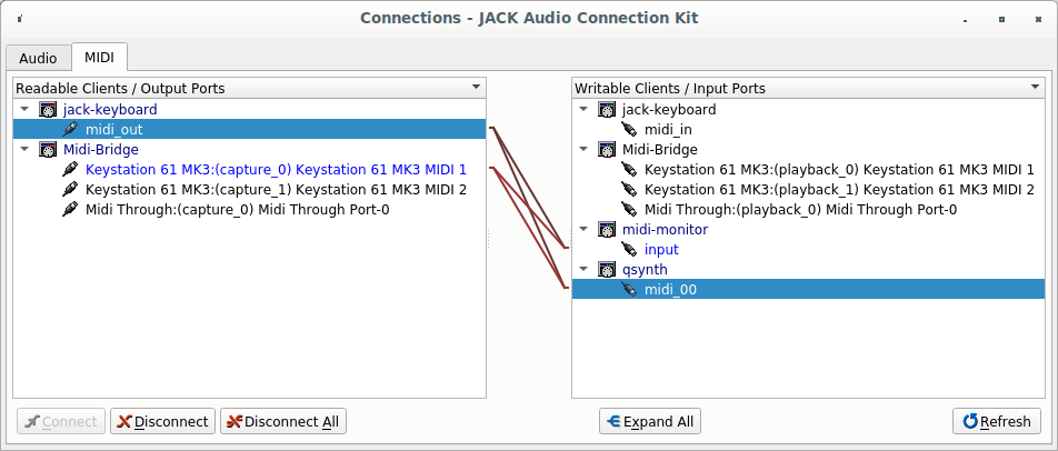 After the qjackctl settings are correct, start the jack-keyboard and jack_midi_dump (a command line program), and make the following connection in the qjackctl: